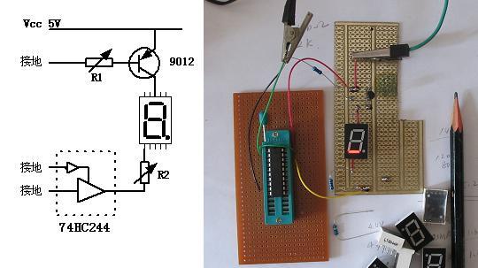 先不接上图的R2和74HC244,将数码管一个段直接接地。调节R1,测得S9012基极电流为0.21mA时集电极也就是数码管上已有40mA,说明放大倍数足够了。这时接上R2和74HC244,调节R2使数码管电流控制在15mA,这样当8个段一起点亮时三极管上得通过120mA的电流。而基极上需要0.63mA,为了减小三极管的负荷应使三极管过饱和,,调节R1使基极电流为2mA,此时测得集电极和漏极之间的电压约0.1V。好!此时R1为2K。R2为240欧姆。确定。