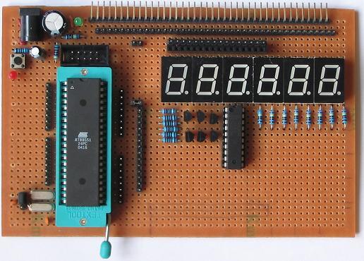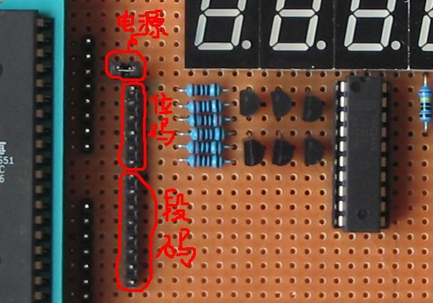 接下来就是确定电路。电路的接口与AT89S51间有三组接口:段码、位码和电源。为了让AT89S51独立出来这三级接口都采用插针做接口,用排线自由连接到AT89S51的P1-P3口,电源用短路帽连接,完成后的板子见下图