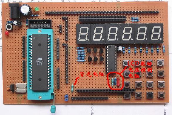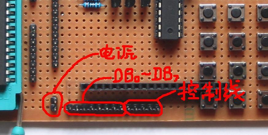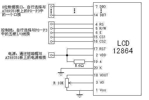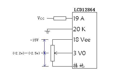 具体的电路还是两个电阻。一个背光限流电阻。一个液晶驱动电压调节电阻。背光电阻还是任何时候在19、20脚与电源之间串上个100欧电位器接上电源。调节电位器到合适亮度。具体值最好是到调试完程序能够正常显示后再将阻值确定换成固定电阻。液晶驱动电压的调整在数据线、电源线接好的前提下是在Vee(-15v)和地之间接一个电位器。中间接V0,通过调节电位器来调节V0上的电压。当V0上为-15V时为全暗(液晶显示为全黑)。当V0为0V时为全亮。调节电位器使屏幕从全暗刚好变到亮时,便可进行程序的调试。待屏幕显示正常后,进行对比度的细调,然后测量这两边的阻值在地和V0之间、V0和Vee之间换成两个固定电阻焊上就好了。注意在V0的电压是在一个很小的范围有效。我的就是在-2.2——-2.5这个范围。仔细调节V0和地之间的电阻使V0上的电压在2.3V。