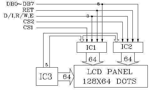 可以看出12864屏是分为左、右两块控制的。所有对屏幕的操作要受片选CS1、CS2来控制。
