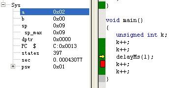 利用Keil C仿真delayMs(1) = 0.00166558s = 1.67ms 截图如下: