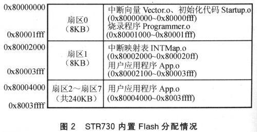 STR730是意法半导体生产的基于ARM7TDMI的微控制器芯片,内置16 KB RAM(0xa0000000~Oxa0003fff)和256 KB Flash(Ox80000000~Ox8003ffff)。内置256 KB Flash的分配情况如图2所示。按照图2中存储器的分配编写Scatter文件,在生成可执行文件时链接器会根据Scatter文件的内容把相关代码段定位到特定的地址上。该例中,程序从Flash启动,且没有使用存储器重映射,因此中断向量必须定位到Flash的起始位置。