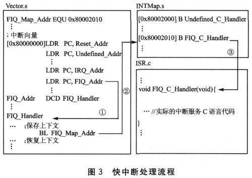 可以通过图3看出快中断的处理流程(其他的中断处理流程类似)。