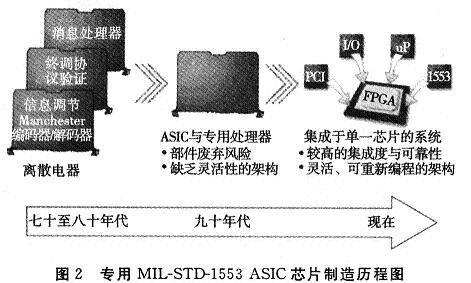 像其它网络技术一样,航空电子市场中的MIL-STD-1.553测试和仿真实施也经历了从庞大的DEC Unibus卡到19英寸的通过机架安装的组件,又发展到用于VME和PCI系统上的较小、较为集成的多通道背板,现在又出现了更小、集成度更高的。 PCMCIA接口。图2描述了专用的MIL-STD-1553 ASIC芯片制造商的实施从离散的协议和收发器芯片组精简到单一的体积小、功耗低的ASIC的发展过程。