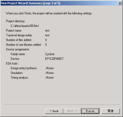 可以使用“File”菜单中的“NewProjectWizard”来创建工程。使用“NewProjectWizard”可以为工程指定工作目录、分配工程名称以及指定最高层设计实体的名称,还可以指定工程中使用的设计文件、其他源文件、用户库、EDA工具以及目标器件。