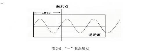 模拟示波器虽然有延迟线,但是,它也只能具有很小的视在延迟时间。数字存储示波器的预触发能力就很强。我们可以通过设置预触发深度的大小来方便的显示触发前后不同时刻的波形。通常,预触发是由延迟触发来实现的。延迟触发分为“+”延迟触发和“—”延迟触发。所谓“+”延迟触发,就是指触发前FIFO的写时钟等于读时钟。触发来后,“+”延迟计数器INT1开始计数。延迟计数过程中,FIFO的写时钟同样等于读时钟。也就是说,触发前直到INT1计数结束FIFO里没有波形数据。当达到计数值后,保持FIFO写时钟,关闭FIFO的读时钟,等到采样数据写满FIFO后将数据拿去处理。它的功能实现在实际过程中就好像整个显示屏幕的波形向左移。如图3-8.所谓“—”延迟触发,就是指存在一个“—”延迟计数器INT2,在触发前FIFO里已经存储了INT2计数值数量(即预触发深度)的波形数据,并在触发到来之前保持预触发深度不变。当触发来之后,写满整个FIFO再读出送去处理。它的功能实现在实际过程中就好像整个显示屏幕的波形向右移。如图3-9.