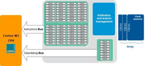 存储器接口是128位宽,每次可取4-8条THUMB2指令。如果执行线性代码,因为预取指功能,即便闪存速度只是内核的四分之一,代码执行也不会出现等待状态。