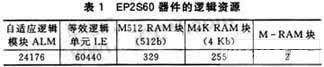 设计中采用的中心处理器FPGA芯片EP2S60包含丰富的存储器逻辑资源,和上一代Stratix系列相比,运行速度提高了50%,逻辑容量增加了1倍,具有达180 Kb的等效逻辑元件和9 Mb的RAM,大大增加了集成度,为高度集成的应用提供了实现基础,而成本比上一代还要低。设计采用的EP2S60器件逻辑资源如表1所列。