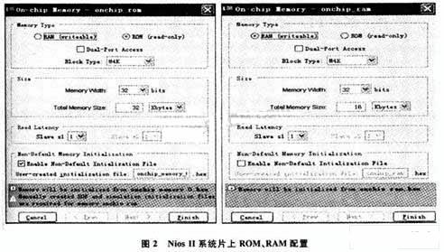 类似计算机系统,软CPU Nios II系统也需要配置片上的ROM和片上RAM,如图2所示。片上ROM设计存储器类型为M4K,数据宽度32位,深度为32 KB,读延迟1。片上RAM存储器类型同样为M4K,数据宽度32位,深度设计为16 KB,读延迟1。