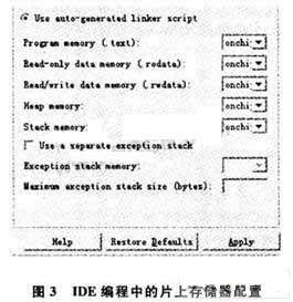 对程序存储器和只读数据存储器,设置为使用片上ROM。对读写数据存储器、堆存储器和堆栈存储器,设置使用片上RAM存储器。这样,可以作到有效的存储器配置。
