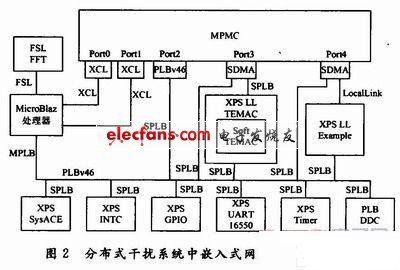在本文设计的分布式干扰系统的嵌入式网关中,SysACECF卡、中断控制INTC、GPIO和串口UART与MieroBlaze处理器之间只进行参数传递,对速度要求不高,因此使用PLB总线与MieroBlaze处理器和多端口内存控制器(MultiPortMemoryController,MPMC)相连;MPMC与Mic-roBlaze处理器之间使用XCL相连。自定义IP核FFT输出信号的频谱数据,对传输速度要求很高,因此使用FSL总线与MicroBlaze内部通用寄存器直接相连。DDC输出信号的时域数据,对传输速度要求最高;为满足传输速度要求,本文参照以太网控制器SoftTEMAC开发了XPS_LL_Exam-pleIP核,通过该IP核的LocalLink接口将信号的时域数据传输到MPMC中进行处理。分布式干扰系统的嵌入式网关片上总线设计如图2所示。