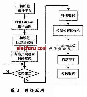 分布式干扰系统中嵌入式网关传输的主要数据为侦察信号时域和频域数据,直接影响着网络通信的效率,因此,本文只对侦察信号时域和频域数据的传输进行检测。网络应用程序采用顺序执行的结构方式。为了能够响应外围设备的中断请求,在程序中为多个外围设备提供了相应的中断服务程序。网络应用程序的流程图如图3所示。