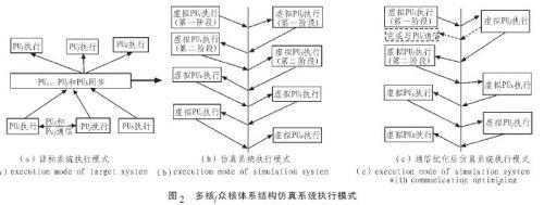 对称多核处理器中处理单元之间的耦合度不同,使得对应的仿真系统的执行模式也不一样。多核/众核体系结构通常采用粗粒度耦合执行的方式。如图2(a)所示.多个处理单元之间相互比较独立,其同步和通信通常处于任务级,即多个处理单元间的通信和同步的次数远小于它们执行的指令数。图中PUi和PUj之间有一次通信,PUi、PUj和PUk之间有一次同步。对应的仿真系统的执行模式如图2(b)所示,VAU先对PUi进行仿真,执行到与通信点时,将PUi的执行信息导入BS,然后VAU对PUi进行仿真,执行到与通信点时,将PUj的执行信息导入BS,将PUi的执行信息由BS导入VMU,对PUi的后续行为进行仿真,以此类推,如图2所示,箭头每穿过中线一次,表示计算页切换一次仿真对象,指向下的箭头表示VMU的信息导入BS,指向上的箭头表示BS中的信息导出至VMU。为了减少现场切换的次数,对两个PU通信时的执行过程进行优化,如图2(c)所示,VAU仿真PUi执行至通信点时,切换至PUj进行仿真,只有在PUj遇到其他同步或通信时,才进行现场切换,否则VAU一直对PUj进行仿真,直至PUj执行结束。PUj执行到与通信点时,PUj将通信数据发送至网络缓冲,并写入PUi对应的存储空间,如图2(c)中虚线所示。
