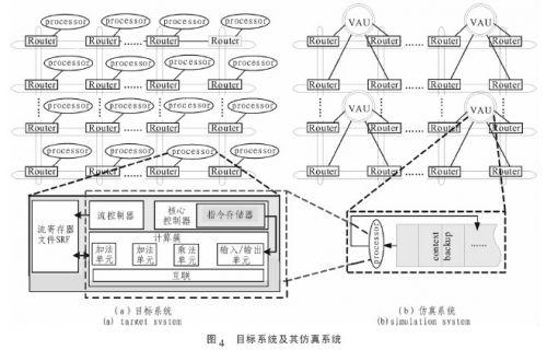 本文的目标系统如图4(a)所示。它由多个计算节点以Torus片上网络连接构成,其计算节点数目可以根据应用需求进行扩展。对应的仿真系统如图4(b)所示。在仿真系统中,采用一个虚拟计算节点(VAU)代替目标系统中的p个计算节点,图4(b)以p=4为例,展示了仿真系统的结构。目标系统中p个计算节点的计算操作都由VAU以图2的工作模式完成。VAU中包含一个现场保存存储器(context backup),用于保存目标系统中p个计算节点的中间结果。contextbackup的容量为每个计算节点中本地存储器容量的p倍,这样,context backup就有足够的能力存储p个计算节点的中间结果,从而减少与外部存储器的数据交换,减少VAU的停顿时间。