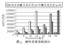 可以看出,仿真系统的执行时间大于目标系统。其时间增量主要是由于仿真系统将目标系统中多个processor并行处理的任务移植到一个VAU上串行执行造成。仿真系统没有改变目标系统的数据传输路径和模式,因此,数据传输的时间并没有增加。另外,由于VAU虚拟的p个pro-cessor共享了存储空间,仿真系统中消除了p个processor之间的数据传输时间。虽然仿真系统相对于目标系统执行时间有所增加,但其时间增量处于秒级。相对于缓慢的软件模拟器,并综合考虑仿真模型对FPGA仿真规模带来的好处,因此认为该仿真模型带来的仿真时间增量是可以接受的。