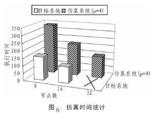 本文采用矩阵乘运算,分别在8、16、32个节点的目标系统和仿真系统上执行,测试二者的仿真速度。目标系统和仿真系统的工作频率为75 MHz。图6展示了二者的执行时间。