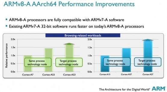 ARM的故事很不一样:看到移动设备对64位计算的需求后,ARM于2011年发布了ARMv8xa064位架构,这是为了下一代ARM指令集架构工作若干年后的结晶。为了基于原有的原则和指令集,开发一个简明的64位架构,ARMv8使用了两种执行模式,AArch32和AArch64。
