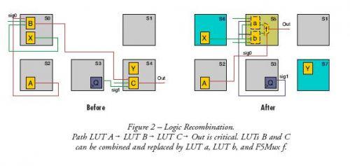 逻辑重组:如果关键路径跨越多个切片中的多个LUT,可利用较少的切片对该逻辑进行重新组织,采用时序上更高效的LUT与多路转换器组合来降低该路径所需的布线资源(图2)。