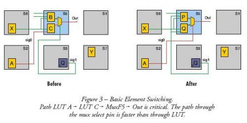 基本单元切换:如果一个功能使用LUT和多路转换器构成,物理综合与优化可对该功能进行重新安排,将最快的路径(一般通过多路转换器选择引脚)分配给最关键的信号(图3)。