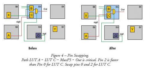 引脚转换:LUT的每个输入引脚可能有不同的延迟,所有Map拥有交换引脚(以及关联的LUT等式)的能力,以便将最关键的信号放置在最快的引脚上(图4)。