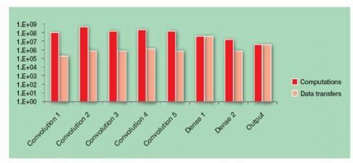 顺序实现产生很大时迟的主要原因在于CNN所涉及的计算的绝对数量。图3显示了AlexNet中每层的计算量和数据传输情况,以说明其复杂性。