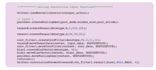 AuvizDNN是Auviz Systems公司提供的一种函数库,用于在FPGA上实现CNN。该函数库提供轻松实现CNN所需的所有对象、类和函数。用户只需要提供所需的参数来创建不同的层。例如,图5中的代码片段显示了如何创建AlexNet中的第一层。