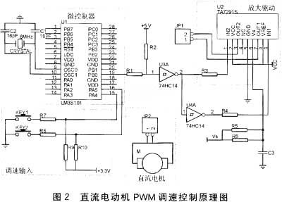 直流电动机PWM调速控制原理图如图2所示。其中,TA7291S是直流电动机驱动芯片,工作电压为4~20V,最大输出电流为0.4 A。
