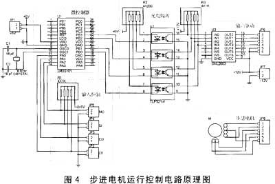 步进电动机运行控制电路原理如图4所示。其中TLP521-4为光隔芯片,UNL2003为达林顿驱动器,用于进行步进电机驱动。
