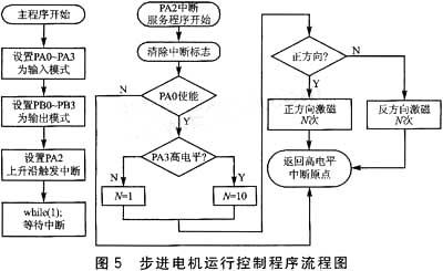 程序流程图如图5所示。主程序等待输入控制信号触发外部中断,每次中断转动N个步距角,其判断过程由中断服务程序实现。