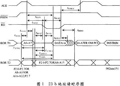 寻址8 MB的数据存储空间,需要有23 b的地址寻址能力,P89C669将传统51内核的P2高位地址时分复用,从而得到23 b地址寻址能力,时序图如图1所示,即当使用23 b地址时,ALE为高时,地址位A16~A22输出到P2.0~P2.6;ALE为低时,地址位A8~A14输出到P2.0~P2.6。无论ALE为何值,位地址A15都从P2.7输出。