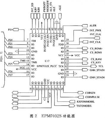 在满足系统资源的前提下,选用EPM7032,将P89C669的P2口作为处理单元输入信号,经过CPLD的内部逻辑进行译码或数据锁存,以获得各个外部设备资源的选择信号及少量的控制信号,如图2所示。