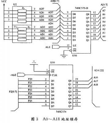A0~A7低地址采用74HC573进行锁存,A16~A18地址内容采用74HC574进行锁存,如图3所示。