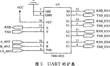 M68AF127B,SST29SF040,74HCA052的功能连接图如图4所示,74HC4052用于UART口的扩展,如图5所示。