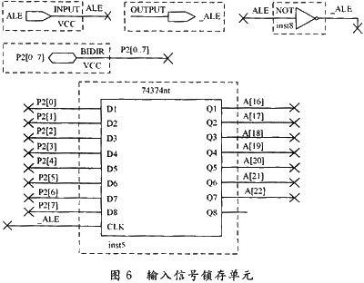 CPLD的设计采用原理图的方法进行设计,简便快捷,如图6所示,采用74374模块锁存P2口的输入信号,ALE反向后得到_ALE作为74374的锁存时钟线输入。