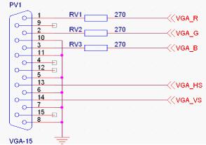 标准的VGA接口连接器为DB15,在15个管脚里面有5个是最重要的。它们分别是红、绿,蓝三基色信号和水平、垂直两个同步控制信号,如图10.18所示,其中,VGA_R、VGA_G、VGA_B、VGA_HS、VGA_VS是直接连接到FPGA的管脚。