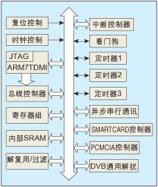 SM1658采用了广泛流行的32位的ARM7TDMI作为CPU核,除了集成一般的SoC芯片具有的存储器管理、中断控制器、定时器、看门狗、异步串口通讯、PLL等常用电路模块外,还在内部集成了256KB的高速SRAM、智能卡接口、PCMCIA(DVB-CI)接口、高速TS流解复用/过滤引擎和DVB通用解扰器等模块。其基本结构如图1所示,只需要一片外接的FLASH程序存储器芯片就可以构成一个高性能CAM卡。