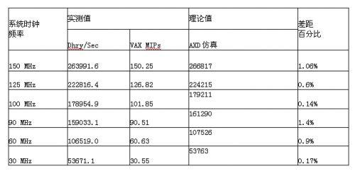 由于我们对芯片的总线、内部存储器进行了优化,为了证实此优化效果。我们对于芯片的最高运算能力进行了基准测试。我们的测试程序使用的是ARM公司提供的参考测试程序Dhrystone2.1(C语言编写),以性能最优的方式进行编译。该测试程序在芯片的内部SRAM中运行。下表是我们的测试结果以及与软件仿真测试结果的比较。可以看到,我们的芯片在最高性能时的执行效率已经基本达到了ARM7TDMI的最好的指标,这也说明,我们的设计是非常优化的。