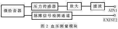 人的心脏在射血过程中,主动脉的输出能加速整个存在于血管中的血液的流动,而血液的惯性则阻碍这个过程,即加速作用只影响到主动脉起始段中的血液,并在此处使压力升高,引起压力脉搏,这就是测量血压时所需要的两个信息:压力与脉搏。由这两种信号可以测定人体最高血压(收缩压)和最低血压(舒张压),并计算出脉搏数,因此要获取这两种信息,就是利用心脏搏动时对血管壁的压力,将脉搏信号和压力信号转换为电信号输出。血压测量模块如图2所示。压力传感器选用Motorola公司的压力传感器MPX53GP02,它具有精确度高、线性度好、成本低等特点,使压力/电信号转换公式和系统血压测量的定标操作都得以简化,节约了软硬件资源。MPX53GP将袖套内的压力信号经过放大、滤波处理后送入A/D转换器。脉搏信号经放大器、鉴别电路、箝位整形后送S3C44B0X外部中断计数。