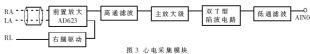 心电信号是从人体体表拾取的微弱电信号,一般只有0.05~5mV,信号频率比较低,频谱范围在0.05~100Hz之间,具有微弱和易受干扰等特点。心电放大电路包括前置放大、RC高通滤波网络、100倍的后级放大、RC低通滤波网络及右腿驱动等模块。心电采集模块如图3所示。前置放大电路采用了低功耗、高精度仪表放大器AD623。它具有高输入电阻、低输入偏置电流、低噪声和高共模抑制比等特点,可通过1脚和8脚间的外接电阻Rg来设置增益(1~1000)。由于体表液体与电极之间可能形成原电池,致使电极之间存在固定的电位差,为避免饱和差分放大的增益不能太高,设定AD623增益为10。后级采用TL084等通用运放构成同相主放大电路,增益可以高达100倍,这样整个电路放大倍数可以达到1000倍。两级放大电路之间必须进行直流隔离。