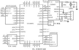S3C44B0X是Samsung公司推出的基于ARM7TDMI的精简指令系统的32位高速处理器,它的工作电压为3.3V,片内带有8个Memory Banks,用于管理外部存储器,最大存储容量达256M;两路UART口,最高传输速率为115200bps;71个I/O口,包括8个外部中断源,可用于键盘、LCD背光、照明控制等;LCD控制器,支持单色,4、16级灰度的LCD模块;内置PLL锁相环,可以设置系统工作频率,最高为75MHz;一路多主机I2C总线、一路SIO总线;四种系统工作模式;一个8路复用10位A/D转换器[2]。片内功能部件齐全,能很好地满足系统设计的需求。系统硬件电路如图4所示。