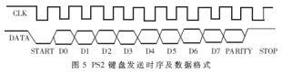 键盘显示以PS2键盘配合LCD液晶显示模块代替传统的矩阵按键和数码管显示,无需键盘显示驱动芯片而与S3C44B0X直接连接,接口简单方便。PS2键盘接口为mini-DIN6引脚连接器,通过DATA、CLK与S3C44B0X的PC4、EXINT0引脚连接。这里只涉及PS2键盘向S3C44B0X发送数据的单向通信,S3C44B0X作为主机对总线有控制权。PS2键盘在时钟作用下向S3C44B0X发送键值数据,S3C44B0X在时钟下降沿接收数据,时钟信号由PS2键盘内部产生。PS2键盘发送时序及数据格式如图5所示。目前使用的PS2键盘都默认采用第二套扫描码集。扫描码分为通码和断码两种类型,当一个键被按下时,键盘将该键的通码发送给S3C44B0X,而该键被释放时键盘会将其断码发送给S3C44B0X。S3C44B0X通过外部中断EXINT0串行读取键值的通码与断码来确定按键,从而选择系统的工作状态。第二套扫描码集可见参考文献[4]。