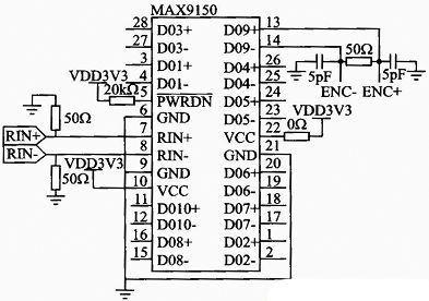 采用LVDS转发器MAX9150转换FPGA所给的时钟信号,作为LTC2207的采集控制信号ENC.MAX9150的转换电路如图2所示。