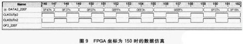 由一个周期采样点数公式N=Tsig/Tsam=fsam/fsig,知此输入频率下采样点数为40 MHz/200 kHz=200,若看坐标-250处的OF17h,则找出一个周期后的那个数是不是和初始值相同。FPGA坐标为150时的数据仿真如图9所示。它处在坐标150的位置为OF07h,和OF17h相差很小。取对应的多组数观察都证明对模拟信号的数据采集亦是比较正确的。