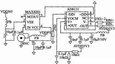 LTC2207的模拟差分信号输入前端的调理芯片采用低噪声、低功耗、超高速开环缓冲器MAX4201和高速差分驱动器AD8131.采集输入信号的前端调理电路如图3所示。图中MAX4201采用±5 V供电,对地并联的电容给电源滤波,为缓冲器提供无干扰的电源。缓冲后的信号,由MAX 4201的5引脚输出,其输出阻抗是50 Ω,再经过AD8131完成单端到差分的转换。