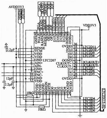 LTC2207是16位A/D转换器,它的采样速率为105Msps.LTC2207是针对输入频率为700 MHz的高频、宽动态范围信号进行数字化处理而设计的。它可以利用PGA前端(输入范围为1.5Vp-p或2.25Vp-p)对该ADC的输入范围进行优化。