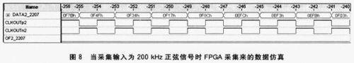 当采集输入是由信号发生器给的200 kHz正弦信号时FPGA采集来的数据仿真如图8所示。