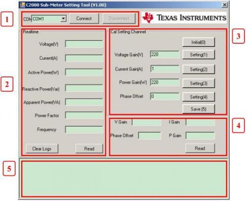 图4的校表软件界面分为5个模块:1,串口连接模块;2,实时数据模块;3,校正数据设置模块;4,校正数据读出模块;5、通讯数据模块。