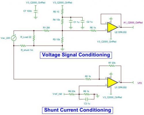 市电220V交流输入,经10k和15k并联再串联2M电阻分压,输入交流电压为220V*(6/(2000+6))=0.66V,直流电压3.3*10/25=1.32V。总的输入电压幅值0.66*1.414+1.32=2.25V,输入信号3.3V以内。电流互感器输入5A/2.5mA(根据互感器具体型号定),取样电阻电压2.5*10=25mV,经运放20倍放大(具体放大倍数调整R9,R10),输入交流信号25*20=0.5V,总的输入电流幅值(10A)1*1.414+1.6=3.014V,输入信号3.3V以内。当使用锰铜电阻获得电流信号时,电流信号调理电路形式如下: