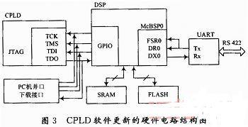 图3中,UART通信口由DSP片上多通道缓冲串行口McBSP0实现。为了存储通过UART口接收到的包含CPLD配置信息的XSVF文件,本系统外扩了一片512 kB的SRAM。FLASH芯片用来存储导航计算机系统升级固件和应用程序。CPLD的JTAG口直接与DSP空闲的4个GPIO口相连,为了提高CPLD器件编程的灵活性,在本系统中保留了连接PC机并口的CPLD程序下载接口。