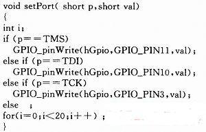 在本文设计的导航计算机系统中,DSP的工作主频为200 MHz,利用TI公司提供的库函数,由该DSP的GPIO口模拟的时钟频率最大不超过3 MHz,可以满足表中TCKMIN参数对应的最大10 MHz的要求。对于建立和保持时间等参数要求,可通过软件延时或定时器实现。由于在本系统的应用中,DSP在上电期间专注于CPLD的软件更新,所以本文将采用软件延时来实现这些参数要求,设计的JTAG口信号电平驱动函数模块代码如下: